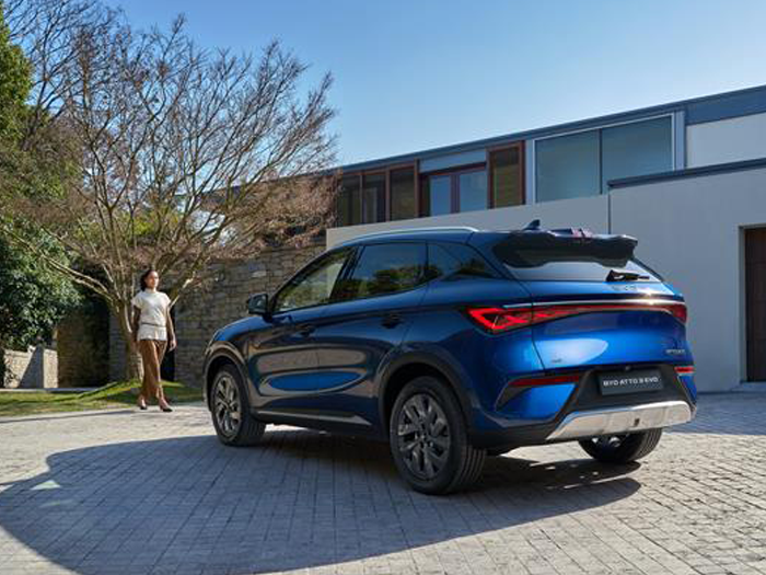 Buitenkant van de ATTO 3 EVO combineert een sportief en expressief design met strakke lijnen, een oplopende taillelijn, opvallende lichtmetalen velgen, doorlopende LED-achterlichten en scherpe koplampen die zowel stijl als zichtbaarheid in het donker verbeteren.