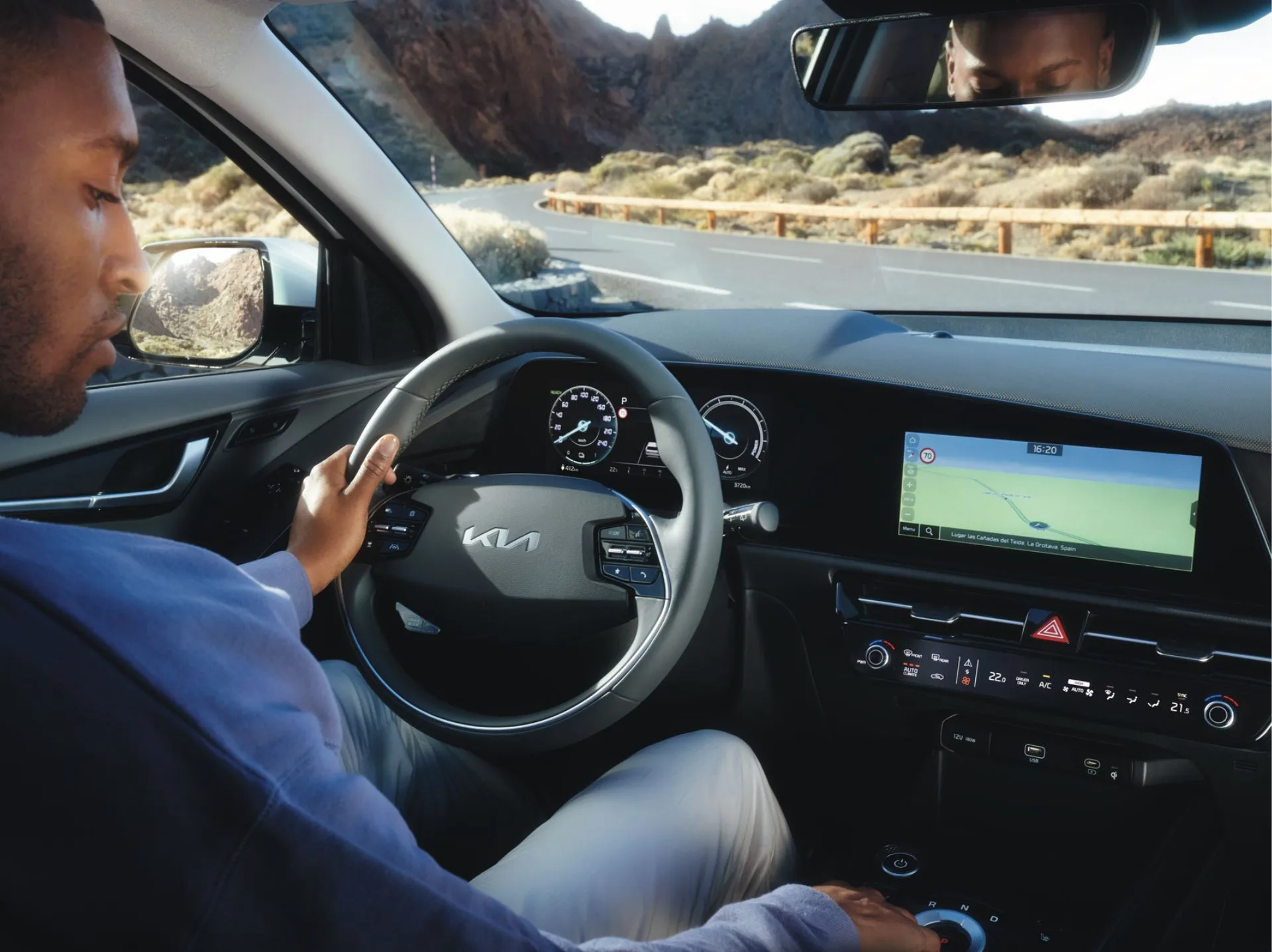 In het interieur van de Kia Niro Hybrid ligt de nadruk op overzicht en rust. De cockpit is naar de bestuurder gericht, met een digitaal instrumentarium en centraal infotainmentscherm, afhankelijk van uitvoering tot 10,25 inch groot. Smartphone-koppeling via Apple CarPlay en Android Auto is voorzien, net als Kia Connect-diensten op geselecteerde versies, zodat navigatie, verkeersinformatie en voertuigstatus altijd beschikbaar zijn.